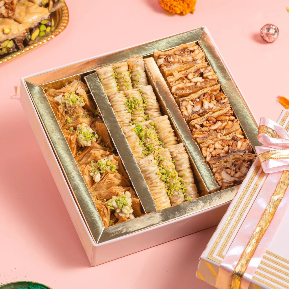 Dimensions- 16.7 X 16.7 X 3.7 Cm Content- Pyramid Baklava, Finger And Almont Square Baklava Net Weight- 250 Gms