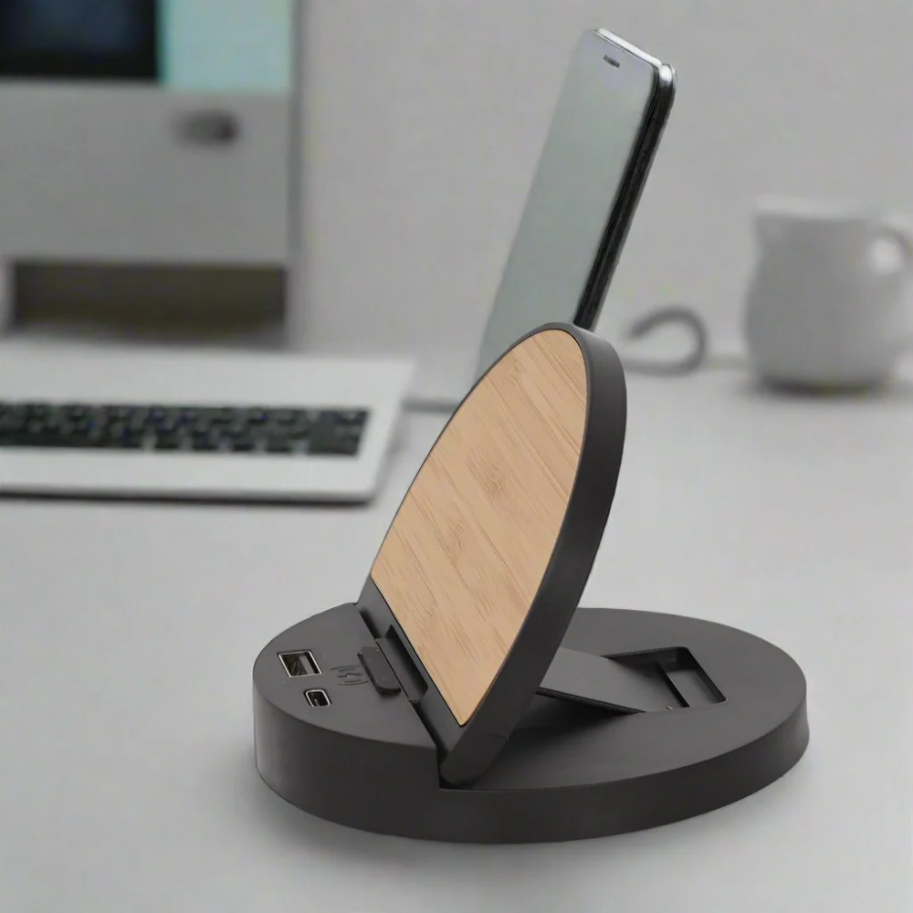 Product features: wireless charger USB HUB Type C Hub Mobile stand Bamboo top
