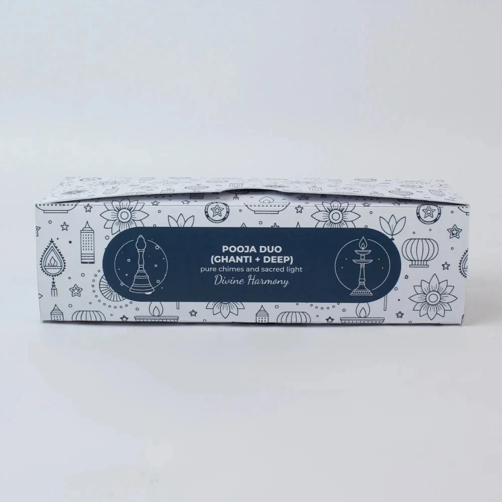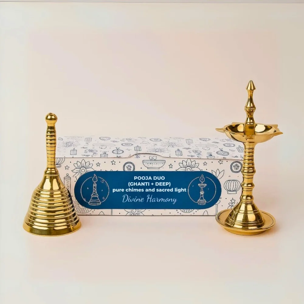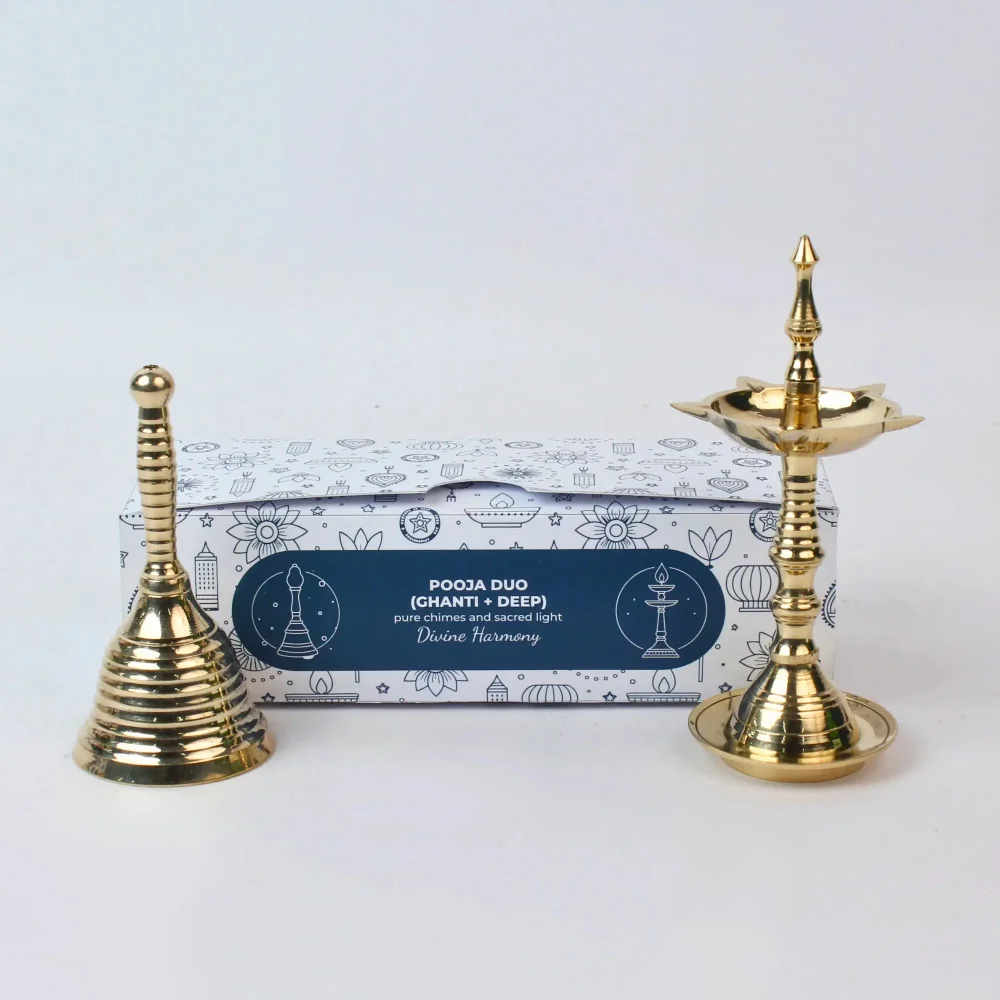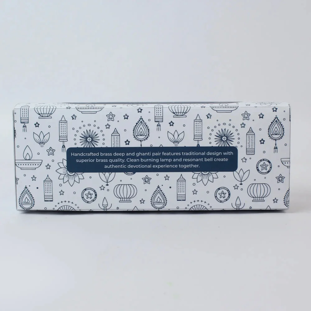 3″ brass ghanti + deep set, beautiful designs, clear tones, heat retention, eco box packaging