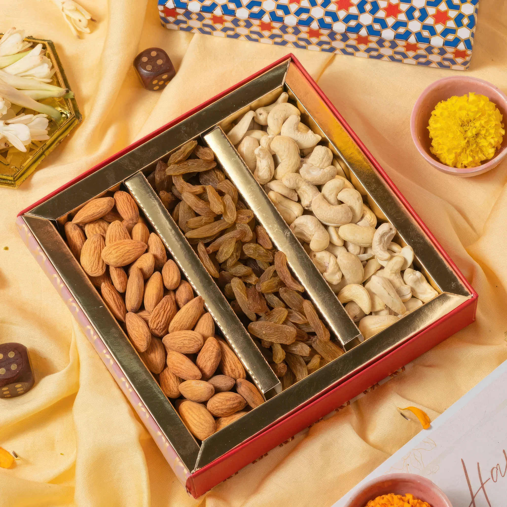 Dimensions- 16.7 X 16.7 X 3.7 Cm Content- Almonds, Raisins And Cashews Net Weight- 250 Gms