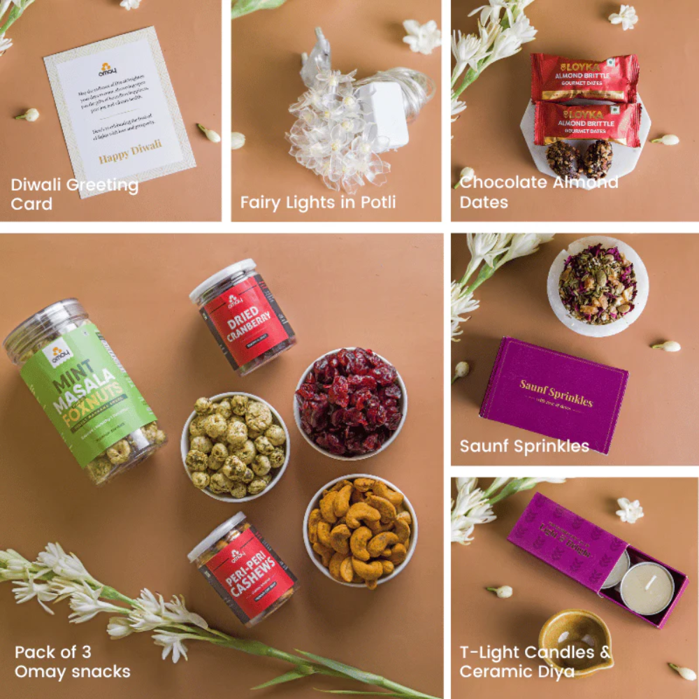 T-Light Candles X 2, Ceramic Diya X 1, Fairy Lights In Potli X 1,