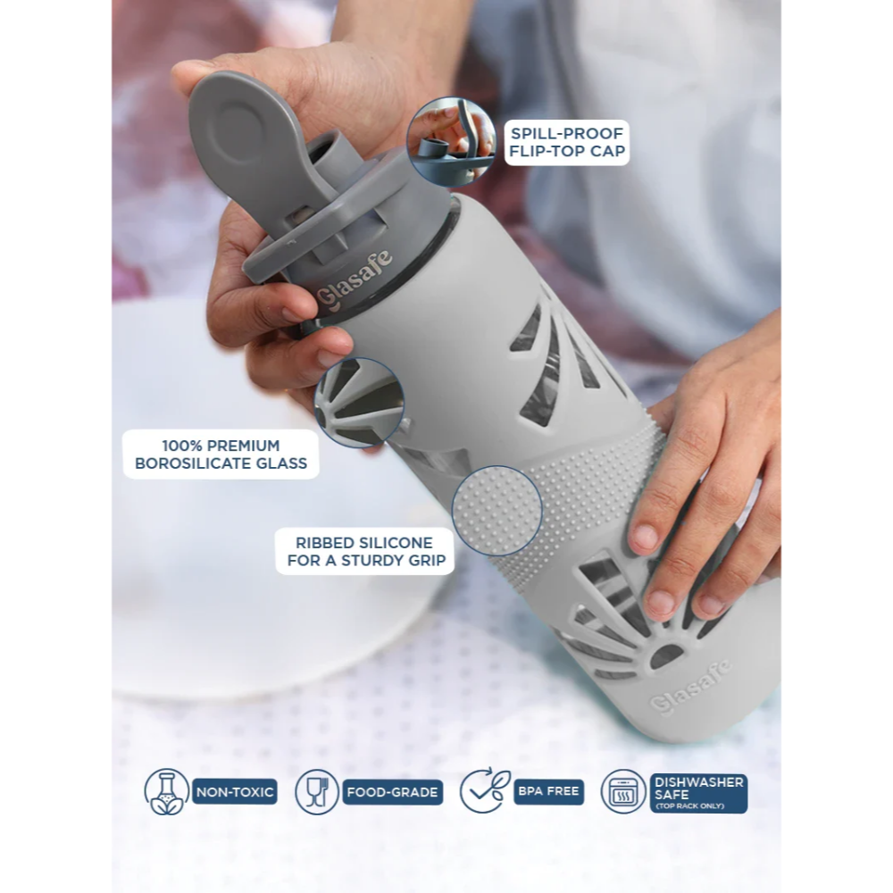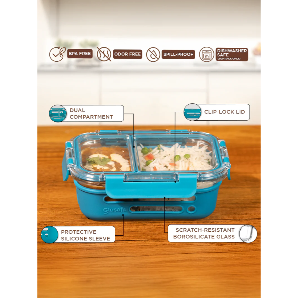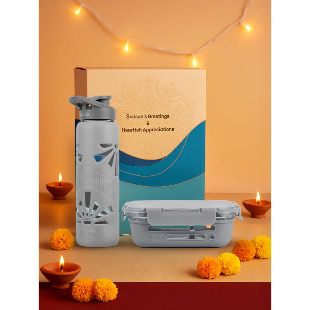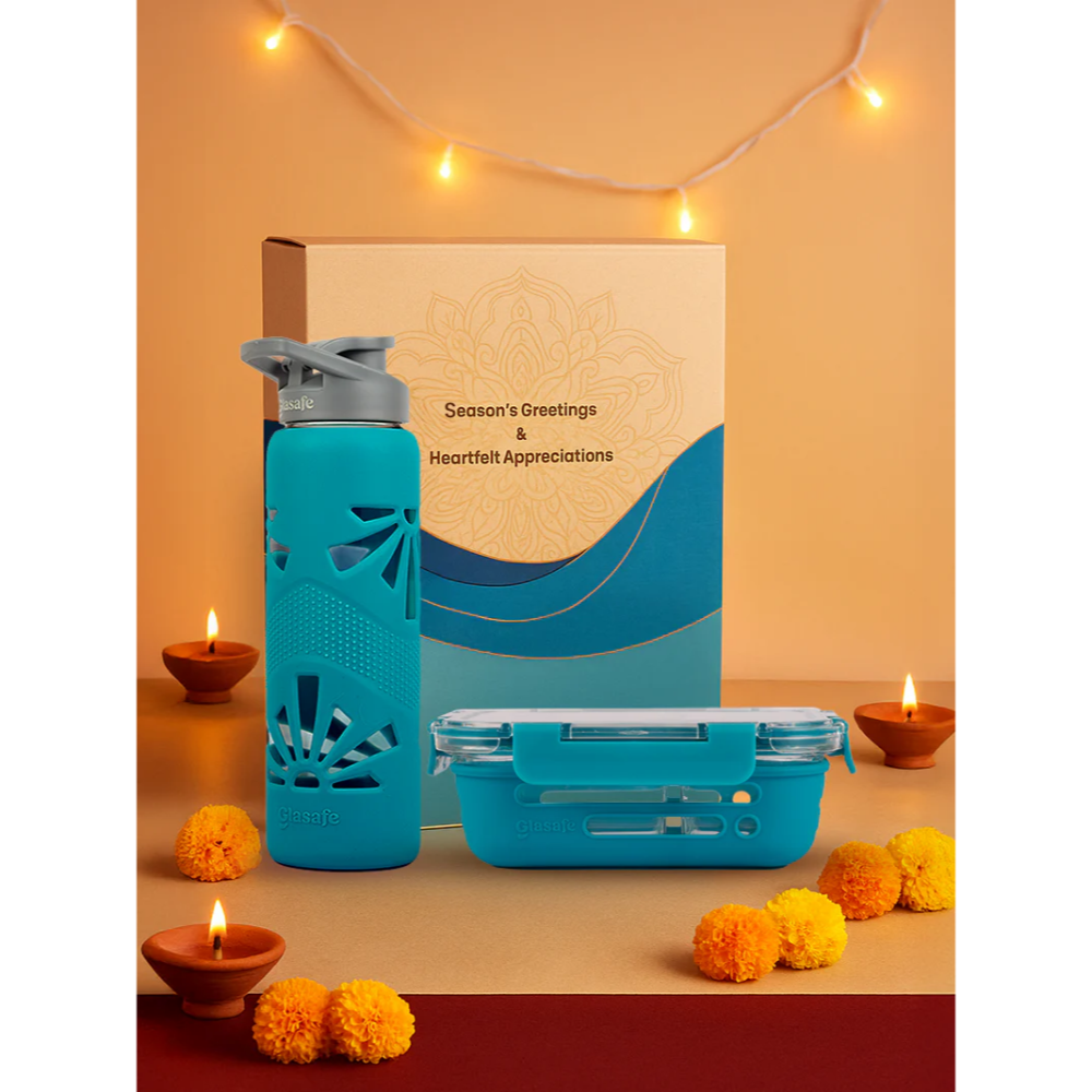 COLORS AVAILABLE: Mellow Mist, Soothing Slate, Tranquil Teal Combo Contents: Glass Bottle 750ml × 1 Glass Tiffin 580ml × 1
