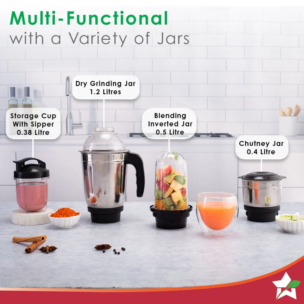 Power: 500W Jar Options: 3 Jars 1.2L Blending Jar 800ml Grinding Jar 300ml Chutney Jar Warranty: 5 Years
